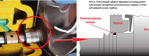 Турбокомпрессор использует бесконтактные лабиринтные уплотнения (газодинамические затворы) для изоляции масляной полости от горячей и холодной частей.