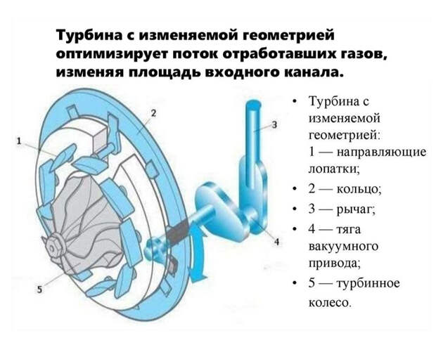 Это современная конструкция, которая повышает эффективность турбокомпрессора на разных оборотах двигателя. Её ключевой элемент — подвижные направляющие лопатки в горячей части.